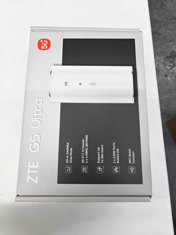 ZTE G5 Ultra 5G Router Specifications: * Product type: 5G Indoor Router * 5G-A, NSA & SA * Compliant with 3GPP R17 standard * 5G NR + LTE EN-DC * 5G Frequency bands: - SA: n1/n2/n3/n5/n7/n8/n18/n20/n26/n28/n38/n40/n41/n48/n71/n75/n76/n77/n78 - NSA: n1/n3/n8/n28/n38/n75/78 * WLAN: Wi-Fi 7,802.11a/b/g/n/ac/ax/be,2.4G & 5G & 6G, tri-band 4 x 4 MIMO, 4K QAM,320MHz, * WiFi speeds up to 19000Mbps * WiFi support up to 384 wireless users * Bandsteering, DL OFDMA,MU-MIMO,BSS Coloring, TWT, Easymesh, MLO * Antenna: - ZTE Smart Antenna 5.0 - Direction: up to 13 dBi - Omni-direction: up to 4dBi * Interface: - 2 x 2.5GE RJ45 - 2 x TS-9 external antenna ports - 1 x RJ11 phone port
